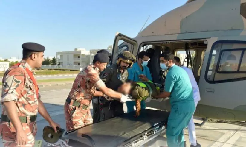 അപകട വിവരം ലഭിച്ചതിനെ തുടർന്ന് സൈനിക ഹെലികോപ്റ്റർ എത്തിച്ചാണ് രക്ഷാപ്രവർത്തനം നടത്തിയത്. രക്ഷാസംഘം സ്ഥലത്തെത്തി പരിക്കേറ്റയാളെ കണ്ടെത്തി. തുടർന്ന്, ആവശ്യമായ ചികിത്സയ്ക്കായി സലാലയിലെ മിലിറ്ററി ആൻഡ് സെക്യൂരിറ്റി സർവിസസ് മെഡിക്കൽ സിറ്റി ആശുപത്രിയിലേക്ക് ഹെലികോപ്റ്ററിൽ മാറ്റി.