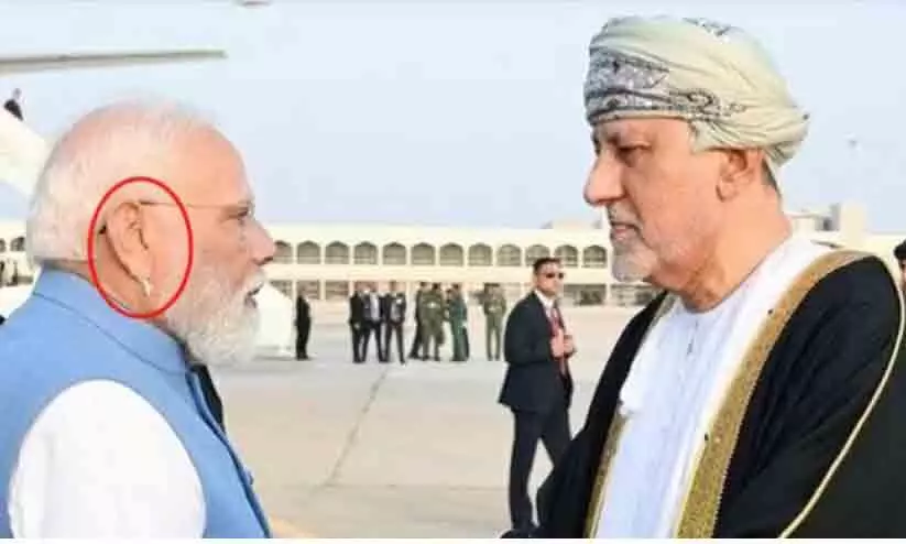 മസ്കത്ത്: ഒമാൻ സന്ദർശനത്തിനായി പ്രധാനമന്ത്രി നരേന്ദ്ര മോദി എത്തിയപ്പോൾ നടന്ന സ്വീകരണ ചടങ്ങിനിടെ പകർത്തിയ ദൃശ്യങ്ങളാണിപ്പോൾ സോഷ്യൽ മീഡിയയിലെ ചർച്ച. ത്രിരാഷ്ട്ര സന്ദർശനത്തിന്റെ ഭാഗമായി എത്തിയ മോദിയെ റോയൽ എയർപോർട്ടിൽ ഒമാൻ പ്രതിരോധ ഉപപ്രധാനമന്ത്രി സ്വീകരിക്കുന്ന സന്ദർഭത്തിൽ മോദിയുടെ വലത് ചെവിയിൽ കാണപ്പെട്ട ചെറിയ, തിളക്കമുള്ള ഒരു ഉപകരണമാണ് സോഷ്യൽ മീഡിയയിൽ വ്യാപകമായ ചർച്ചക്ക് വഴിവച്ചത്.