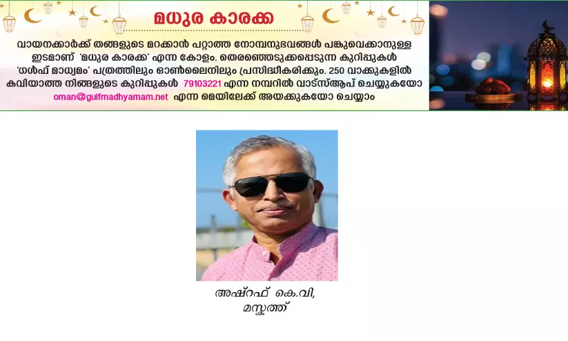 പ്രാർഥനക്കുശേഷം ജോലി സ്ഥലങ്ങളിലേക്ക് തിരിച്ചെത്താൻ ആളുകൾ വന്നതിനെക്കാൾ തിരക്കിൽ പുറത്തേക്ക് ഒഴുകിക്കൊണ്ടിരിക്കുന്നു. തിരക്കാണ് പ്രവാസിയുടെ അടയാളം. അതില്ലെങ്കിൽ പ്രവാസിയില്ല. നീണ്ട പ്രാർത്ഥനക്കായി ആകാശത്തേക്ക് കൈകൾ നീട്ടി നിൽക്കുന്ന ദേവാലയ ഗോപുരങ്ങളിൽ നിന്നുള്ള വെളിച്ചം പുറത്തേക്ക് പ്രവഹിക്കുന്ന ആളുകളുടെ നെറ്റിത്തടങ്ങളിൽ പതിച്ച് തിളങ്ങുന്നു. സൽക്കർമങ്ങളോടെ വ്രതമനുഷ്ഠിക്കുന്നവർക്കുള്ള സമ്മാനം സ്വർഗമാണെന്നുള്ള ദൈവിക കീർത്തനങ്ങൾ ദേവാലയത്തിൽ നിന്ന് ഒഴുകിവരുന്നത് കേട്ടപ്പോൾ പ്രവാസിയാണ് അതിന് ഏറ്റവും അനുയോജ്യരായ അവകാശികൾ എന്ന് തോന്നി. ധിറുതിവെച്ച് ഞാനും റൂമിലേക്ക് തിരിച്ച് നടന്നു. ഭക്ഷണം കഴിക്കാതെ ഉമ്മ എന്നെ കാത്തിരിക്കുന്നുണ്ടാവും.