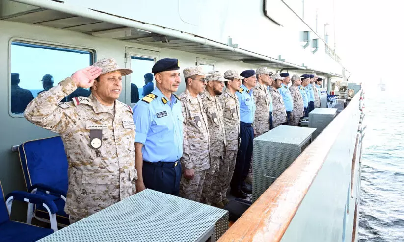 റോയൽ നേവി ഓഫ് ഒമാനും റോയൽ സൗദി നാവികസേനയും അൽ ബാത്തിന കടൽ മേഖലയിൽ സംഘടിപ്പിച്ച ‘വിൻഡ്സ് ഓഫ് പീസ് 2026’ സംയുക്ത അഭ്യാസപ്രകടനത്തിൽനിന്ന്