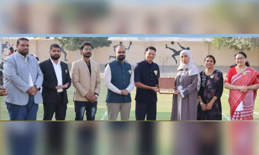 ഇന്ത്യൻ സ്കൂൾ മുലദ്ദയിൽ നടന്ന ഫൗണ്ടേഷനൽ സ്പോർട്സ് ഡേ മുഖ്യാതിഥിയെ ആദരിക്കുന്നു