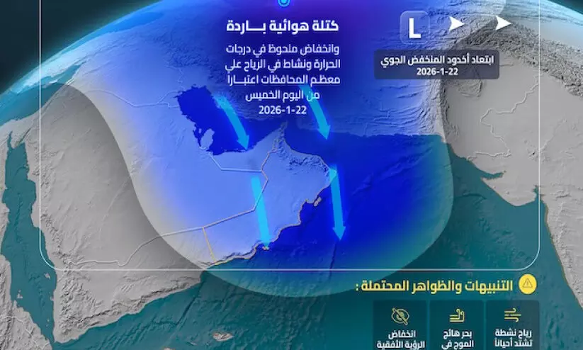 ഉൾനാടൻ പ്രദേശങ്ങളിലെയും ഉയർന്ന പ്രദേശങ്ങളിലെയും പല ഭാഗങ്ങളിലും താപനില ഗണ്യമായി താഴ്ന്നു. സൈഖിൽ 6.3 ഡിഗ്രി സെൽഷ്യസും സുനൈനയിൽ 9.9 ഡിഗ്രിയും രേഖപ്പെടുത്തി. യൻഖുൽ 10.2 ഡിഗ്രിയിലേക്കും ബുറൈമി 10.5 ഡിഗ്രിയിലേക്കും മഹ്ദ 10.7 ഡിഗ്രിയിലേക്കും താപനില താഴ്ന്നു. ദാഹിറ ഗവർണറേറ്റിൽ ധാങ്കിൽ 11.0 ഡിഗ്രിയും ഇബ്രിയിൽ 12.1 ഡിഗ്രിയും ഫഹൂദിൽ 12.5 ഡിഗ്രിയും ബഹ്ലയിൽ 12.6 ഡിഗ്രിയും താപനില രേഖപ്പെടുത്തി. പുലർച്ചെയും രാത്രിയിലും തണുപ്പ് തുടരാനിടയുള്ളതിനാൽ, പ്രത്യേകിച്ച് പർവതപ്രദേശങ്ങളിലുള്ളവർ ആവശ്യമായ മുൻകരുതലുകൾ സ്വീകരിക്കണമെന്ന് അധികൃതർ നിർദേശിച്ചു.