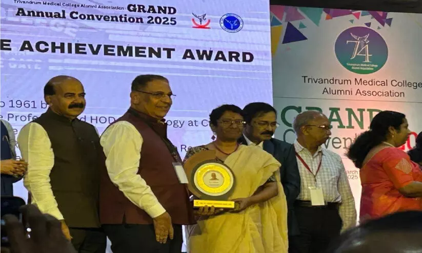 തിരുവനന്തപുരം മെഡിക്കൽകോളജിൽ നടന്ന പ്ലാറ്റിനം ജൂബിലി കൺവെൻഷനിൽ കേരള സംസ്ഥാന ചീഫ് സെക്രട്ടറി ശാരദ മുരളീധരനിൽനിന്ന് ‘ടി.എം.സി ലൈഫ് ടൈം അച്ചീവ്മെന്റ് അവാർഡ്’ ഡോ. സി. തോമസ് ഏറ്റുവാങ്ങുന്നു