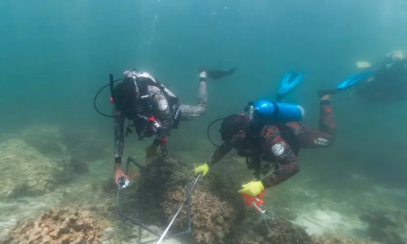 ദൈമാനിയാത്ത് ദ്വീപ് പ്രകൃതി സംരക്ഷണ കേന്ദ്രത്തിൽ കടലിന്റെ അടിത്തട്ടിൽ ഡൈവിങ് വിദഗ്ദർ പവിഴപ്പുറ്റുകൾ വെച്ചുപിടിപ്പിക്കുന്നു