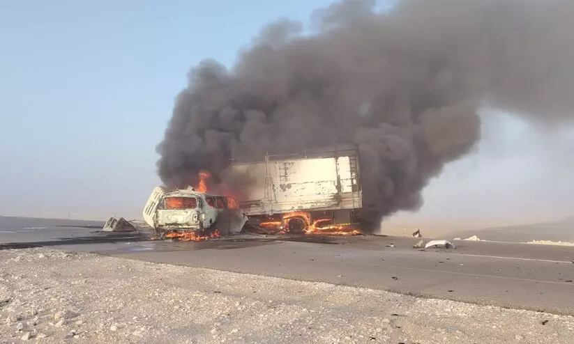 ഹൈമ: സലാലയിൽ നിന്ന് 400 കിലോമീറ്റർ അകലെ ഹൈമക്കടുത്ത് മക്ഷനിൽ രണ്ട് വാഹനങ്ങൾ കൂട്ടിയിടിച്ച് കത്തി. ഒരു ട്രക്കും ഒരു ഫോർ വീൽ വാഹനവുമാണ് അപകടത്തിൽപെട്ടത്.