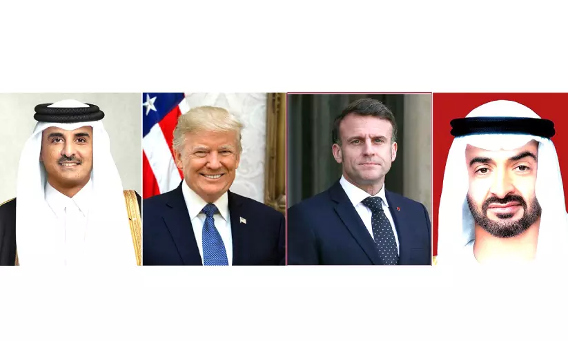 അമീർ ശൈഖ് തമീം ബിൻ ഹമദ് ആൽഥാനി, അമേരിക്കൻ പ്രസിഡന്റ് ഡോണൾഡ് ട്രംപ്, ഫ്രഞ്ച് പ്രസിഡന്റ് ഇമ്മാനുവൽ മാക്രോൺ, യു.എ.ഇ പ്രസിഡന്റ് ശൈഖ്
