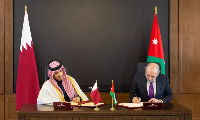 ഖത്തർ -ജോർഡൻ ജോയന്റ് ഹയർ കമ്മിറ്റി യോഗത്തിൽ സുപ്രധാന കരാറുകളിൽ ഖത്തർ പ്രധാനമന്ത്രി ശൈഖ് മുഹമ്മദ് ബിൻ അബ്ദുൽറഹ്മാൻ ബിൻ ജാസിം ആൽഥാനിയും ജോർഡൻ ഉപപ്രധാനമന്ത്രി ഡോ. അയ്മൻ സഫാദിയും ഒപ്പുവെക്കുന്നു