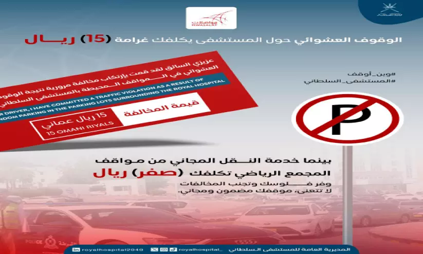 നിയമലംഘനങ്ങൾക്ക് 15 ഒമാനി റിയാൽ പിഴ ഈടാക്കുമെന്ന് റോയൽ ഹോസ്പിറ്റൽ അധികൃതർ അറിയിച്ചു. ആശുപത്രി കെട്ടിടങ്ങൾക്കു ചുറ്റുമുള്ള അനധികൃത പാർക്കിങ് ഒഴിവാക്കണമെന്നും പകരം സന്ദർശകർ, സുൽത്താൻ ഖാബൂസ് സ്പോർട്സ് കോംപ്ലക്സിലുള്ള സൗജന്യ പാർക്കിംഗ് സൗകര്യം ഉപയോഗപ്പെടുത്തണം. അവിടെ നിന്ന് ആശുപത്രിയിലേക്കും തിരിച്ചും സൗജന്യ ബസ് ഷട്ടിൽ സേവനം ഒരുക്കിയിട്ടുണ്ടെന്നും ഇതു പ്രയോജനപ്പെടുത്താനും അധികൃതർ നിർദേശിച്ചു.