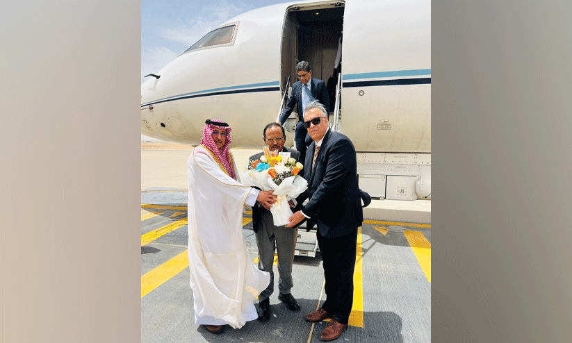 സൗദിയിൽ ഔദ്യോഗിക സന്ദർശനം നടത്തിയ ഇന്ത്യൻ ദേശീയ സുരക്ഷാ ഉപദേഷ്ടാവ് അജിത് ഡോവലിനെ ഇന്ത്യൻ അംബാസഡർ ഡോ. സുഹേൽ അജാസ് ഖാനും സൗദി വിദേശകാര്യ ഡെപ്യൂട്ടി മിനിസ്റ്റർ ഡോ. സൗദ് അൽ സാതിയും ചേർന്ന് സ്വീകരിച്ചപ്പോൾ