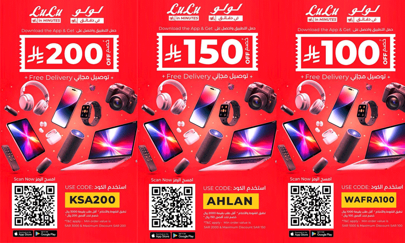 ലുലു ഓണ്ലൈന് ഷോപ്പിംഗ് ഓഫറുകളെ ഏറ്റവും ആകര്ഷകമാക്കുന്നത് കൂപ്പണ് കോഡ് ഓഫറുകളാണ്. കുറഞ്ഞത് മൂവായിരം റിയാലിന് ലുലു ഓണ്ലൈനിലൂടെ സാധനങ്ങള് വാങ്ങുന്ന ഉപഭോക്താക്കള്ക്ക് KSA200 എന്ന കോഡ് ഉപയോഗിച്ച് തത്സമയം 200 റിയാല് വരെ ഷോപ്പിംഗില് വിലക്കിഴിവ് നേടാനാകും. AHLAN കൂപ്പണ് കോഡ് ഉപയോഗിച്ച് രണ്ടായിരം റിയാലിന് ഷോപ്പിംഗ് നടത്തുന്നവര്ക്ക് 150 റിയാല് വരെയും, WAFRA100 കോഡ് ഉപയോഗിച്ച് ആയിരം റിയാലിന് സാധനങ്ങള് വാങ്ങുന്നവര്ക്ക് 100 റിയാല് വരെയും പരമാവധി ഡിസ്കൗണ്ട് സ്വന്തമാക്കാം.