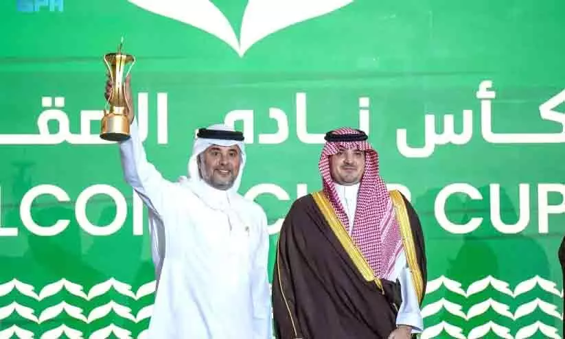 സൗദി ഫാൽക്കൻ ക്ലബ് കപ്പ് ടുർണമെന്റിൽ വിജയിയോടൊപ്പം ഡെപ്യൂട്ടി ഗവർണർ അമീർ സുഊദ് ബിൻ ബന്ദർ ബിൻ അബ്ദുൽ അസീസ്