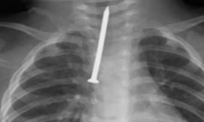അപ്രതീക്ഷിതമായി കുഞ്ഞ് ആണി വിഴുങ്ങുകയും അത് ശ്വാസനാളത്തിൽ തടയുകയുമായിരുന്നു. അഞ്ച് സെൻറീമീറ്റർ നീളമുള്ള ആണി പ്രധാന ശ്വാസകോശ കുഴലിലേക്ക് കടന്നതോടെ കുഞ്ഞിെൻറ നില അതീവ ഗുരുതരമായി. തുടർന്ന് ഒട്ടും വൈകാതെ തന്നെ കുഞ്ഞിനെ ഓപ്പറേഷൻ തിയേറ്ററിലേക്ക് മാറ്റുകയും ‘റിജിഡ് ബ്രോങ്കോസ്കോപ്പി’ എന്ന അത്യാധുനിക എൻഡോസ്കോപ്പി സംവിധാനം ഉപയോഗിച്ച് ആണി പുറത്തെടുക്കുകയുമായിരുന്നു.