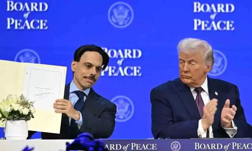 ഗസ്സ പുനർനിർമാണത്തിനുള്ള ‘സമാധാന കൗൺസിൽ’ കരാറിൽ സൗദി വിദേശകാര്യ മന്ത്രി അമീർ ഫൈസൽ ബിൻ ഫർഹാൻ ഒപ്പുവെച്ചപ്പോൾ