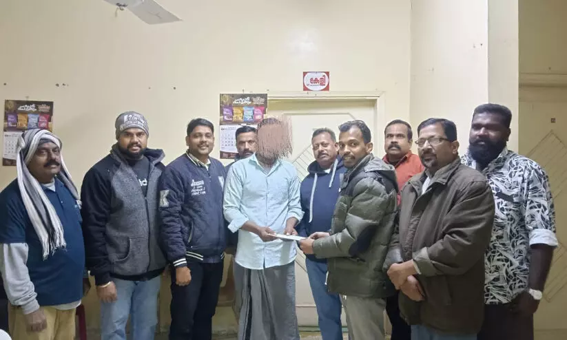 നാട്ടിലേക്ക് മടങ്ങുംമുമ്പ് അജിക്ക് കേളി പ്രവർത്തകർ യാത്രാരേഖകൾ കൈമാറുന്നു