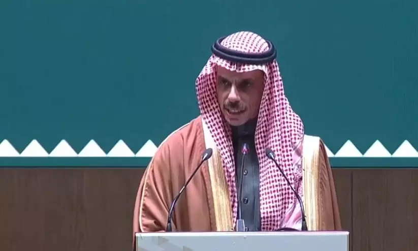 സൗദി വിദേശകാര്യ മന്ത്രി അമീർ ഫൈസൽ ബിൻ ഫർഹാൻ റിയാദിൽ വാർത്താസമ്മേളനത്തിൽ സംസാരിക്കുന്നു