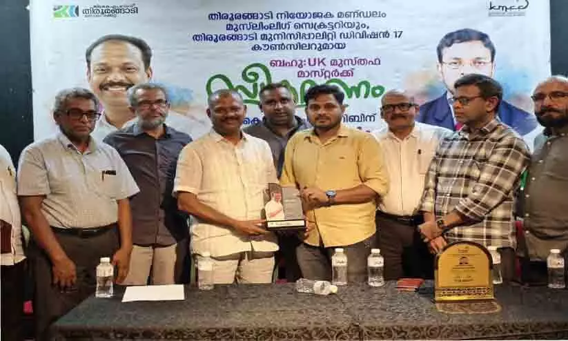 യു.കെ. മുസ്തഫ മാസ്റ്റർക്കുള്ള കെ.എം.സി.സി തിരൂരങ്ങാടി മണ്ഡലം കമ്മിറ്റി ഉപഹാരം പ്രസിഡൻറ് ജാഫർ വെന്നിയൂർ നൽകുന്നു