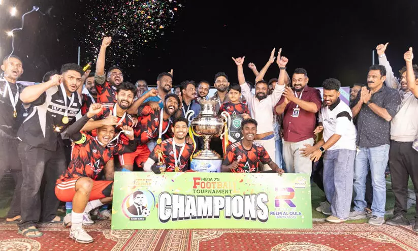 കെ.എം.സി.സി യാംബു മെഗാ സെവൻസ് ഫുട്ബാൾ ടൂർണമെന്റിൽ ജേതാക്കളായ അക്നെസ് എഫ്.സി ടീം കപ്പുമായി