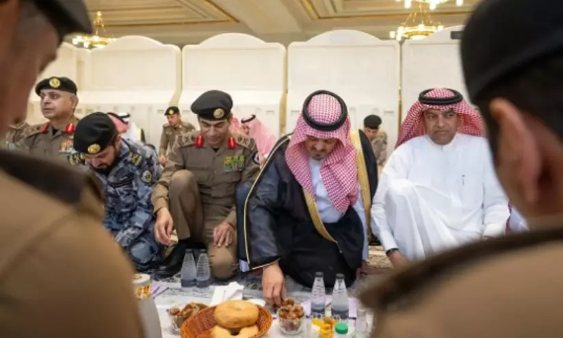 മക്ക ഡെപ്യൂട്ടി ഗവർണർ അമീർ സഊദ് ബിൻ മിശ്അൽ ഹറം പള്ളിയിൽ സുരക്ഷാ സേനാംഗങ്ങൾക്കൊപ്പം ഇഫ്താർ വിരുന്നിൽ പങ്കുചേർന്നപ്പോൾ