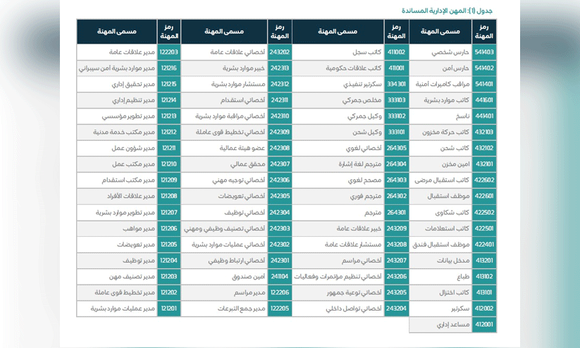 ഈ പട്ടികയിൽ നൽകിയിരിക്കുന്ന തൊഴിലുകൾ മിക്കവാറും സൗദി പൗരന്മാർക്കായി മാറ്റിവെച്ചിട്ടുള്ളതോ അല്ലെങ്കിൽ ഉയർന്ന തോതിൽ സ്വദേശിവൽക്കരണം നടപ്പാക്കിയതോ ആയ തസ്തികകളാണ്.