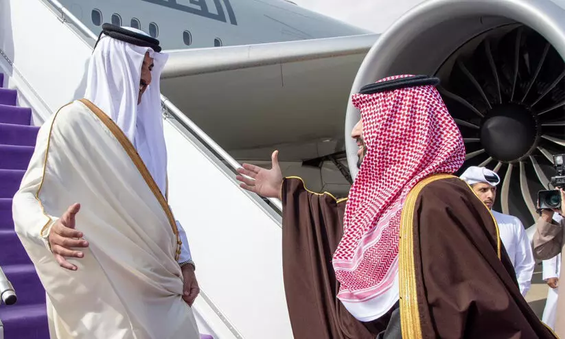 റിയാദിലെത്തിയ ഖത്തർ അമീർ ശൈഖ് തമീം ബിൻ ഹമദ് ആൽഥാനിയെ സൗദി കിരീടാവകാശി അമീർ മുഹമ്മദ് ബിൻ സൽമാൻ സ്വീകരിക്കുന്നു