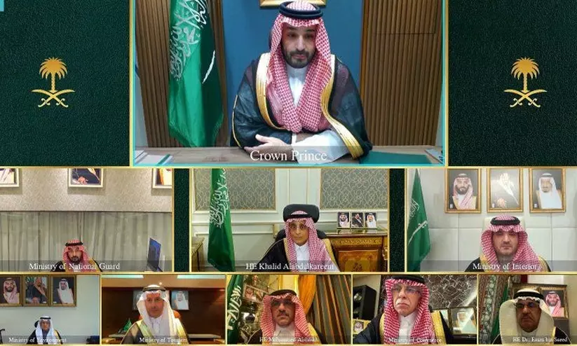 സൗദി കിരീടാവകാശി മുഹമ്മദ് ബിൻ സൽമാന്റെ നേതൃത്വത്തിൽ നടന്ന വിഡിയോ കോൺഫറൻസിങ് യോഗത്തിൽനിന്ന്
