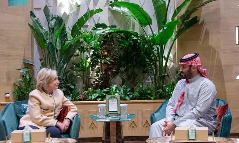 സൗദി കിരീടാവകാശി അമീർ മുഹമ്മദ് ബിൻ സൽമാൻ, മുൻ യു.എസ് സ്റ്റേറ്റ് സെക്രട്ടറി ഹിലരി ക്ലിൻറണുമായി റിയാദിലെ അൽ-യമാമ കൊട്ടാരത്തിൽ കൂടിക്കാഴ്ച നടത്തിയപ്പോൾ