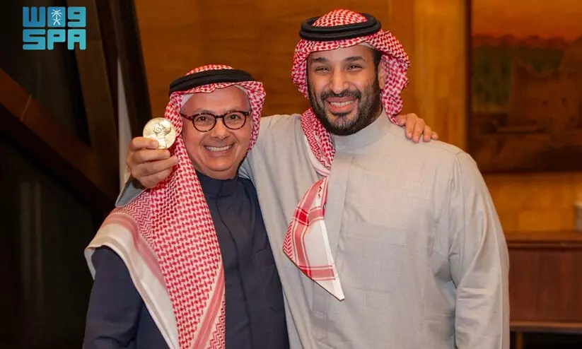 രസതന്ത്രത്തിനുള്ള നോബൽ സമ്മാന ജേതാവായ പ്രഫ. ഉമർ യാഗിയെ സൗദി കിരീടാവകാശി അമീർ മുഹമ്മദ് ബിൻ സൽമാൻ സ്വീകരിച്ചപ്പോൾ