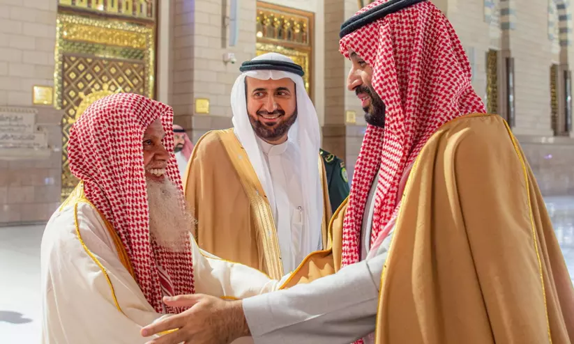 സൗദി കിരീടാവകാശിയും പ്രധാനമന്ത്രിയുമായ അമീർ മുഹമ്മദ് ബിൻ സൽമാൻ മദീനയിലെ മസ്ജിദുന്നബവി സന്ദർശിച്ചപ്പോൾ