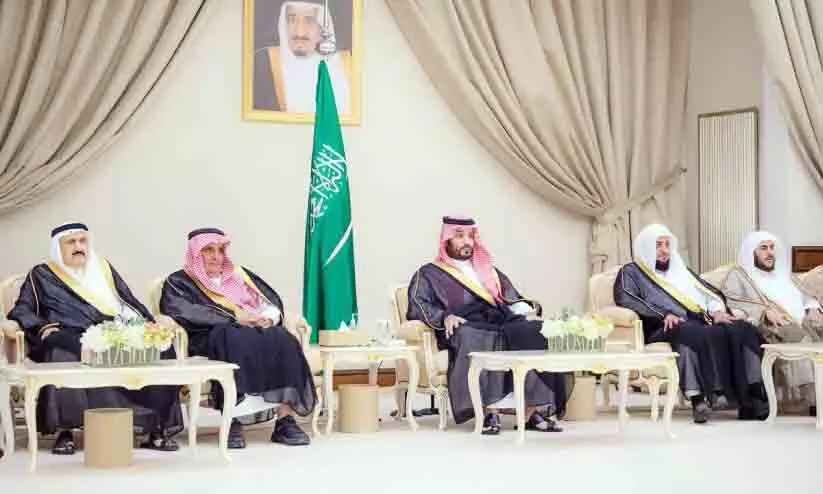 സൗദി കിരീടാവകാശി അമീർ മുഹമ്മദ് ബിൻ സൽമാൻ ദമ്മാം അൽ ഖലീജ് കൊട്ടാരത്തിൽ കിഴക്കൻ പ്രവിശ്യയിലെ പൗരപ്രമുഖരുമായി കൂടിക്കാഴ്ച നടത്തിയപ്പോൾ