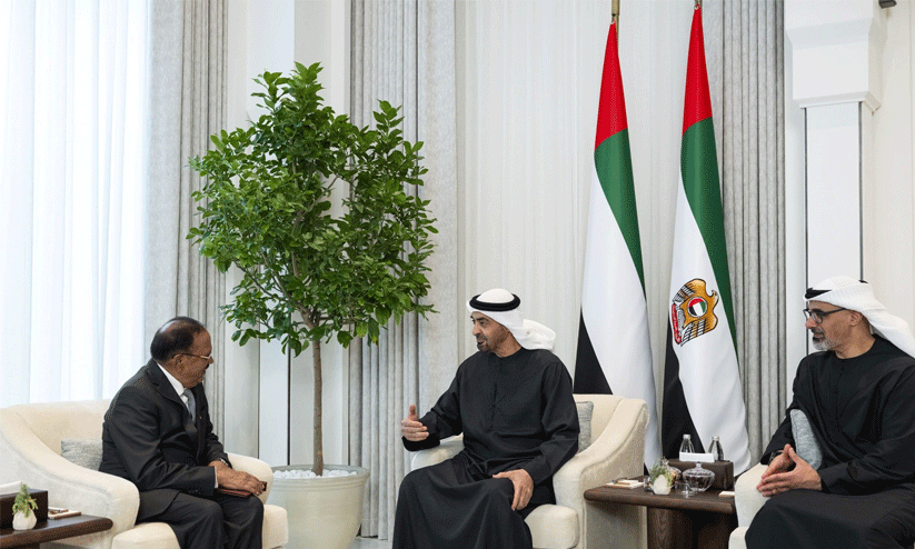 ഇന്ത്യയുടെ ദേശീയ സുരക്ഷ ഉപദേഷ്ടാവ് അജിത് ഡോവൽ യു.എ.ഇ പ്രസിഡന്റ് ശൈഖ് മുഹമ്മദ് ബിൻ സായിദ് ആൽ നഹ്യാനുമായി കൂടിക്കാഴ്ച നടത്തുന്നു. ശൈഖ് ഖാലിദ് ബിൻ മുഹമ്മദ് ബിൻ സായിദ് ആൽ നഹ്യാൻ സമീപം