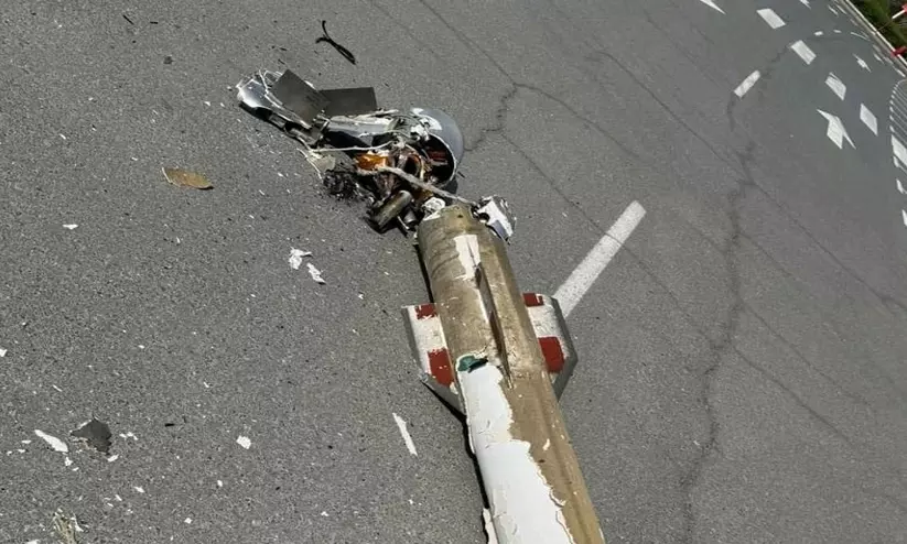 യു.എ.ഇ പ്രതിരോധസേന തകർത്ത മിസൈൽ അവശിഷ്ടം റോഡിൽ വീണുകിടക്കുന്നു