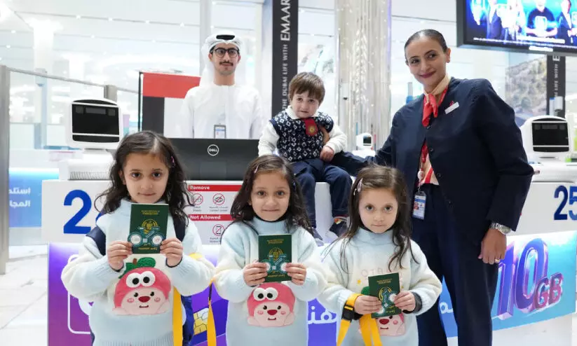 ദുബൈ എയർപോർട്ടിൽ ദുബൈ സൈക്ലിങ് പാസിന്റെ സ്വാഗത സ്മരണിക സ്റ്റിക്കറുമായി കുട്ടികൾ
