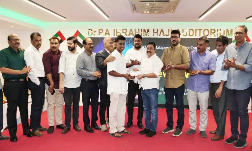 ദുബൈ കെ.എം.സി.സി മെംബർഷിപ് ഷിദിൻനാഥിന് നജീബ് കാന്തപുരം എം.എൽ.എ കൈമാറുന്നു