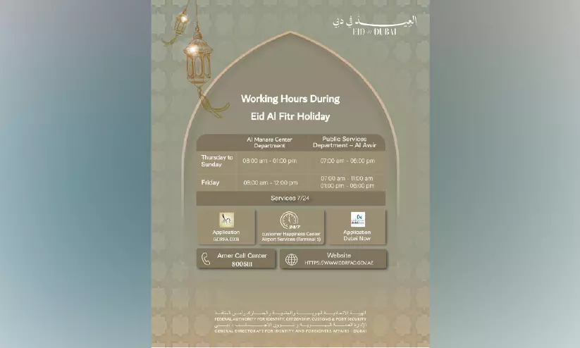 ദുബൈ: എമിറേറ്റിലെ വിസ സേവനങ്ങൾക്കുള്ള ജനറൽ ഡയറക്ടറേറ്റ് ഓഫ് ഐഡന്റിറ്റി ആൻഡ് ഫോറിനേഴ്സ് അഫയേഴ്സ്-ദുബൈ(ജി.ഡി.ആർ.എഫ്.എ) ഈദുൽ ഫിത്ർ അവധിക്കാലത്തെ ഔദ്യോഗിക പ്രവർത്തന സമയങ്ങൾ പ്രഖ്യാപിച്ചു. അവധിക്കാലത്തും സേവനങ്ങൾ തടസ്സമില്ലാതെ ലഭ്യമാക്കുന്നതിനായി സർവീസ് സെന്ററുകളും ഡിജിറ്റൽ സംവിധാനങ്ങളും സജീവമാക്കുമെന്ന് അധികൃതർ വ്യക്തമാക്കി. വ്യാഴാഴ്ച മുതൽ ആരംഭിച്ച അവധിക്ക് ശേഷം മാർച്ച് 23 തിങ്കളാഴ്ച മുതൽ സാധാരണ പ്രവർത്തനം പുനരാരംഭിക്കും. ദുബൈ അന്താരാഷ്ട്ര വിമാനത്താവളം -ടെർമിനൽ 3ലെ ആഗമന ഭാഗത്തെ കസ്റ്റമർ ഹാപ്പിനസ് സെന്റർ ആഴ്ചയിൽ ഏഴു ദിവസവും 24 മണിക്കൂറും പ്രവർത്തിക്കും.