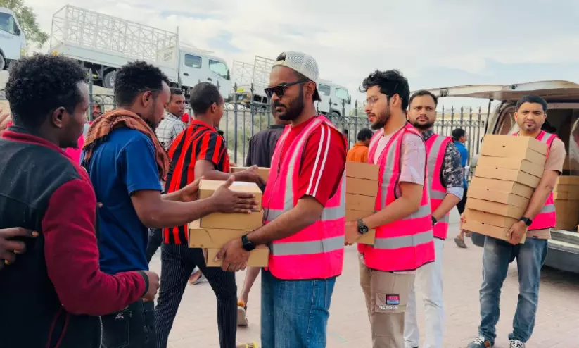 ഇലവൻ സ്റ്റാർ പടന്ന യു.എ.ഇ ഷാർജ സജാ ലേബർ ക്യാമ്പിലെ തൊഴിലാളികൾക്ക് ഇഫ്താർ കിറ്റ് വിതരണം ചെയ്യുന്നു