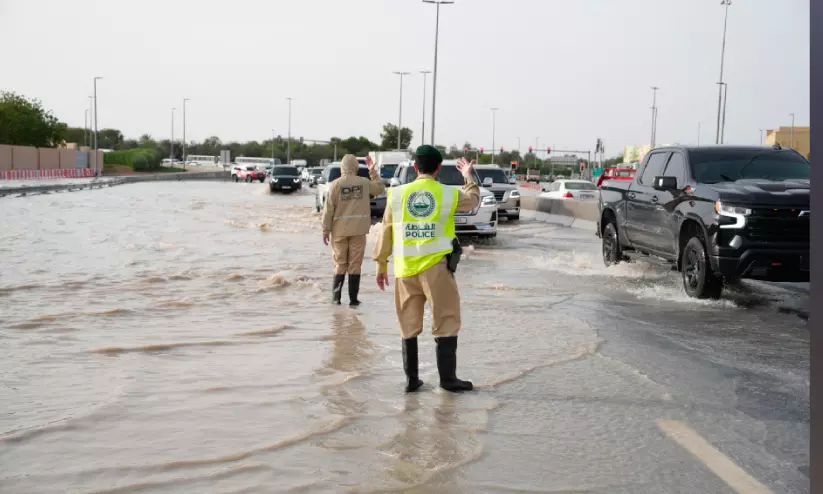ശക്തമായ മഴയിൽ ദുബൈയിലെ റോഡിൽ വെള്ളം നിറഞ്ഞതിനെ തുടർന്ന് ട്രാഫിക് നിയന്ത്രിക്കുന്ന ദുബൈ പൊലീസ്