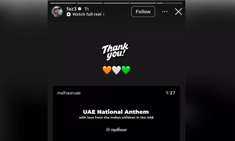 വീഡിയോ സോഷ്യൽ മീഡിയയിൽ വ്യാപകമായി ശ്രദ്ധ നേടിയതിന് പിന്നാലെയാണ് ശൈഖ് ഹംദാൻ ഇന്സ്റ്റഗ്രാം സ്റ്റോറിയിൽ റീൽ പങ്കുവെച്ചുകൊണ്ട് നന്ദിയറിയിച്ചത്. ഹാർമോണിയം, തബല, തബല തരംഗ്, ഡോലക്, പഖാവജ്, സിത്താർ, സരോദ്, ഓടക്കുഴൽ, ജൽതരംഗ് തുടങ്ങിയ ഉപകരണങ്ങൾ ഉപയോഗിച്ച് 13 ഇന്ത്യൻ വിദ്യാർഥികൾ ചേർന്നാണ് അവതരണം നടത്തിയത്. യു.എ.ഇ പതാകയുടെ നിറങ്ങളിലുള്ള സ്കാർഫ് ധരിച്ചും വെള്ള വസ്ത്രങ്ങളണിഞ്ഞുമാണ് സംഗീതം അവതരിപ്പിച്ചത്.