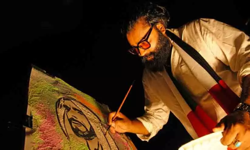 ഡോ. നിജിത്ത് ചന്ദ്രൻ ഏഴ് എമിറേറ്റിലെ മണൽ ഉപയോഗിച്ച് ശൈഖ് സായിദിന്റെ കാൻവാസ് ഒരുക്കുന്നു