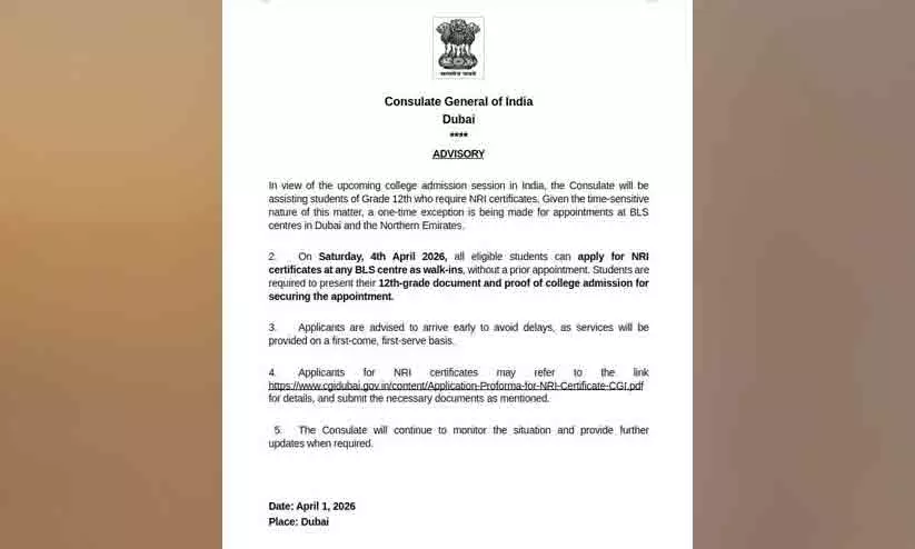 ദുബൈ: യു.എ.ഇയിൽ 12ാം ക്ലാസ് പൂർത്തിയാക്കിയ പ്രവാസി വിദ്യാർഥികൾക്ക് കേരളത്തിൽ കോളജ് പ്രവേശനത്തിനായി എൻ.ആർ.ഐ സർട്ടിഫിക്കറ്റ് ലഭ്യമാക്കാൻ പ്രത്യേക സൗകര്യം ഏർപ്പെടുത്തി ദുബൈ ഇന്ത്യൻ കോൺസുലേറ്റ്. യോഗ്യരായ വിദ്യാർഥികൾക്ക് ഏപ്രിൽ നാലിന് ദുബൈയിലോ വടക്കൻ എമിറേറ്റിലോ ഉള്ള ഏതെങ്കിലും ബി.എൽ.എസ് സെന്ററുകളിൽ മുൻകൂർ അപ്പോയ്മെന്റ് ഇല്ലാതെ തന്നെ എൻ.ആർ.ഐ സർട്ടിഫിക്കറ്റിന് അപേക്ഷ സമർപ്പിക്കാം. അപ്പോയിൻമെന്റ് ലഭിക്കാൻ വിദ്യാർഥികളുടെ 12ാം ക്ലാസ് ഗ്രേഡ് സർട്ടിഫിക്കറ്റ്, കോളജിൽ പ്രവേശനം ലഭിച്ചതിന്റെ രേഖ എന്നിവ ഹാജരാക്കണമെന്ന് കോൺസുലേറ്റ് അറിയിച്ചു. ആദ്യം എത്തുന്നവർക്കായിരിക്കും അപ്പോയ്മെന്റിൽ മുൻഗണന. നീണ്ട ക്യൂ ഒഴിവാക്കാൻ വിദ്യാർഥികൾ നേരത്തെ എത്താൻ ശ്രമിക്കണം. അപേക്ഷ ഫോറം, ആവശ്യമായ രേഖകളുടെ പട്ടിക എന്നിവ കോൺസുലേറ്റിന്റെ ഔദ്യോഗിക വെബ്സൈറ്റായ https://www.cgidubai.gov.in/content/Application-Proforma-for-NRI-Certificate-CGl.pdfൽ നിന്ന് ഡൗൺലോഡ് ചെയ്യാം.