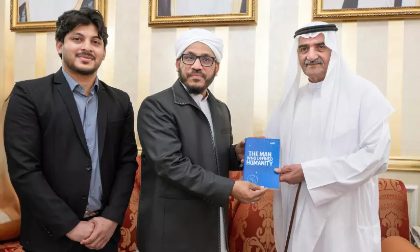ഡോ. മുഹമ്മദ് ഫാറൂഖ് നഈമി അൽ ബുഖാരി രചിച്ച ‘ദ മാൻ ഹൂ ഡിഫൈൻഡ് ഹ്യൂമാനിറ്റി’ ശൈഖ് ഹമദ് ബിൻ മുഹമ്മദ് അൽ ശർഖി പ്രകാശനം ചെയ്യുന്നു