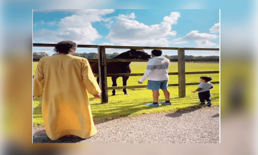 ദുബൈ കിരീടാവകാശിയും എക്സിക്യൂട്ടിവ് കൗൺസിൽ ചെയർമാനുമായ ശൈഖ് ഹംദാൻ ബിൻ മുഹമ്മദ് ബിൻ റാശിദ് ആൽ മക്തൂമാണ് വിഡിയോ ഇൻസ്റ്റഗ്രാമിൽ പങ്കുവെച്ചത്. അദ്ദേഹം മകൻ റാശിദിനൊപ്പം പന്തയക്കുതിരയായ ‘ദുബാവി’യെ കാണുന്നതും തീറ്റ വായിൽ വെച്ചുകൊടുക്കുന്നതുമാണ് വിഡിയോയിലുള്ളത്. സമീപത്ത് തന്നെ യു.എ.ഇ വൈസ് പ്രസിഡന്റും പ്രധാനമന്ത്രിയും ദുബൈ ഭരണാധികാരിയുമായ ശൈഖ് മുഹമ്മദ് ബിൻ റാശിദ് ആൽ മക്തൂം നിൽക്കുന്നതും മകനെയും പേരക്കുട്ടിയെയും വീക്ഷിക്കുന്നതും വിഡിയോയിലുണ്ട്.