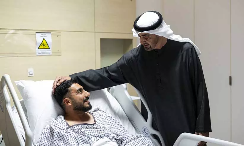 ആക്രമണത്തിൽ പരിക്കേറ്റ് ചികിൽസയിൽ കഴിയുന്നയാളോട് സംസാരിക്കുന്ന ശൈഖ് മുഹമ്മദ് ബിൻ സായിദ് ആൽ നഹ്യാൻ
