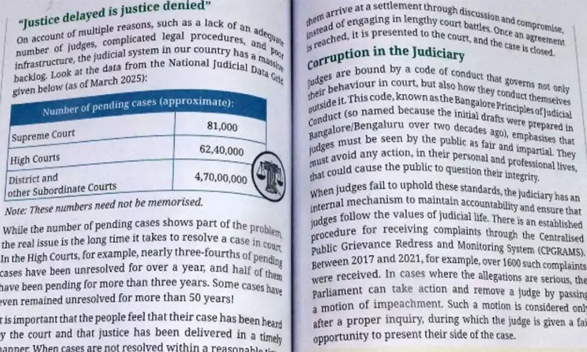 ജുഡീഷ്യറിയിലെ അഴിമതി, കെട്ടിക്കിടക്കുന്ന കേസുകൾ എന്നിവയെക്കുറിച്ച് ചർച്ച ചെയ്യുന്ന ഒരു പാഠഭാഗം പ്രസിദ്ധീകരിച്ചതിൽ എൻ.സി.ഇ.ആർ.ടി പരസ്യമായി മാപ്പ് പറഞ്ഞു. എട്ടാം ക്ലാസ് സാമൂഹിക ശാസ്ത്ര പാഠപുസ്തകമായ എക്സ്പ്ലോറിങ് സൊസൈറ്റി: ഇന്ത്യ ആൻഡ് ബിയോണ്ട്" (ഭാഗം II) എന്ന പുസ്തകത്തിലെ നാലാം അധ്യായമായ 'ദി റോൾ ഓഫ് ജുഡീഷ്യറി ഇൻ ഔവർ സൊസൈറ്റി' എന്ന ഭാഗത്തിനെതിരെയാണ് കോടതി രൂക്ഷമായ വിമർശനം ഉന്നയിച്ചത്.