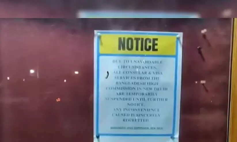 ന്യൂഡൽഹി: ന്യൂഡൽഹിയിലെ ബംഗ്ലാദേശ് ഹൈകമീഷൻ ഇന്ത്യക്കാർക്കുള്ള വിസ, കോൺസുലർ സേവനങ്ങൾ താൽക്കാലികമായി നിർത്തിവെച്ചു. ഒഴിവാക്കാനാവാത്ത സാഹചര്യങ്ങള് കാരണം സേവനങ്ങൾ തൽക്കാലം നിർത്തിവെക്കുകയാണെന്നാണ് അറിയിപ്പ്.
