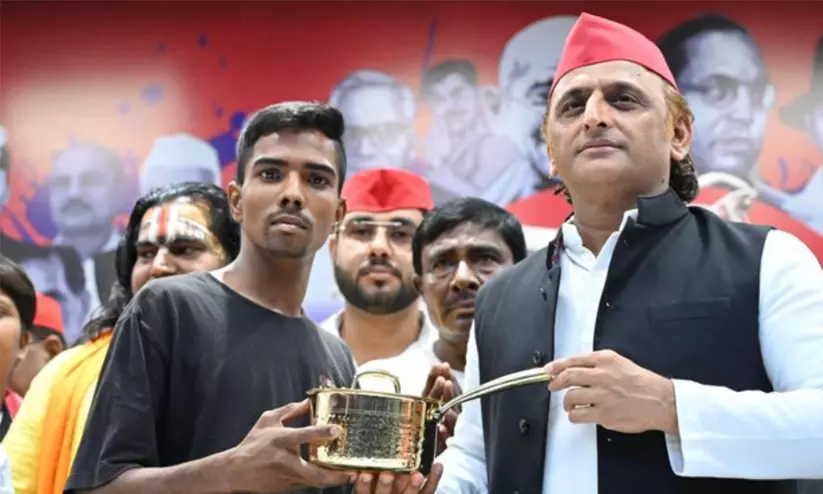 ലക്നൗവിലെ പാർട്ടി ഓഫിസിലേക്ക് ആര്യനെ വിളിച്ചുവരുത്തിയ അഖിലേഷ് യാദവ് വെങ്കല പാത്രങ്ങൾ സമ്മാനിക്കുന്നു