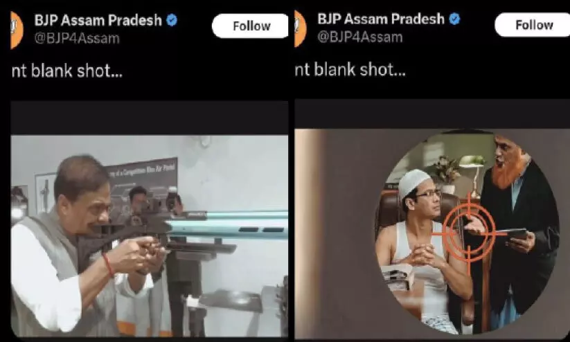 അസമിൽ സ്പോർട്സ് കോംപ്ലക്സ് സന്ദർശിച്ച അസം മുഖ്യമന്ത്രി പിസ്റ്റൾ പിടിച്ച് ഉന്നം വെക്കുന്ന വിഡിയോ ക്ലിപ് ഉപയോഗിച്ച് മുസ്ലിംകളെ പോയന്റ് ബ്ലാങ്കിൽ നിർത്തുന്ന വിഡിയോ നിർമിച്ചാണ് അസം ബി.ജെ.പി ‘എക്സ്’ ഹാൻഡിലിൽ പങ്കുവെച്ചത്.