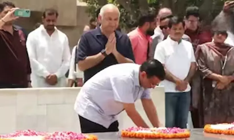 അരവിന്ദ് കെജ്രിവാളും മനീഷ് സിസോദിയയും രാജ്ഘട്ടിലെത്തി മഹാത്മാഗാന്ധിക്ക് മുമ്പിൽ ആദരമർപ്പിക്കുന്നു