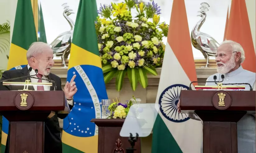 പ്രധാനമന്ത്രി നരേന്ദ്ര മോദിയും ബ്രസീൽ പ്രസിഡന്റ് ലുയിസ് ലുലാ സിൽവയും സംയുക്ത വാർത്തസമ്മേളനത്തിനിടെ