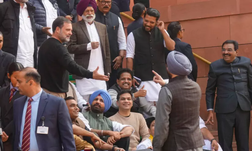 സഭാകവാടത്തിൽ പ്രതിപക്ഷ എം.പിമാരുടെ ധർണക്കിടെ പ്രകോപനവുമായെത്തിയ കേന്ദ്ര സഹമന്ത്രി രവനീത് ബിട്ടുവുമായി സംസാരിക്കുന്ന രാഹുൽ ഗാന്ധി