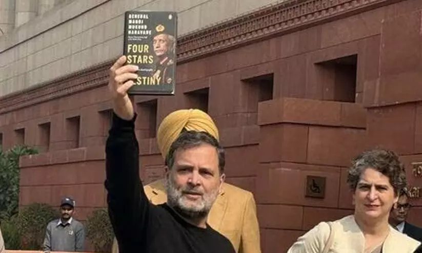 ആഭ്യന്തര മന്ത്രാലയത്തിന്റെ അനുമതി ലഭിക്കാത്തതിനാൽ പ്രകാശനം നടത്താത്ത, പെൻഗ്വിൻ ബുക്സ് പ്രസിദ്ധീകരിക്കുന്ന നരവനെയുടെ ‘ഫോർ സ്റ്റാർസ് ഓഫ് ഡെസ്റ്റിനി’ എന്ന പുസ്തകത്തിന്റെ കോപ്പിയുമായാണ് ബുധനാഴ്ച രാഹുൽ സഭയിൽ എത്തിയത്.
